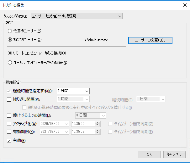 ローカルPCにファイルを保存するため、タスクスケジューラーでリモートデスクトップ接続したときに実行するように設定しておく。その際、ローカルリソースのCドライブを利用することを指定している。